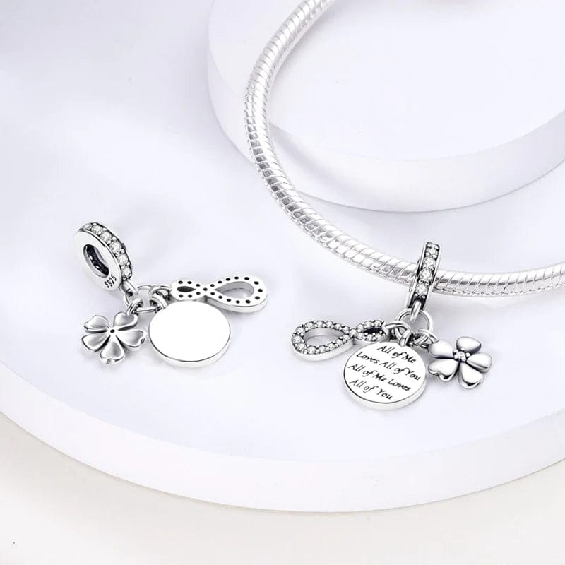 Express love with the All of Me Loves All of You Infinity Flower Dangle Charm by Pangama Jewelry. Made from , this charm showcases an infinity symbol, a delicate flower, and a meaningful engraved message, representing eternal love.