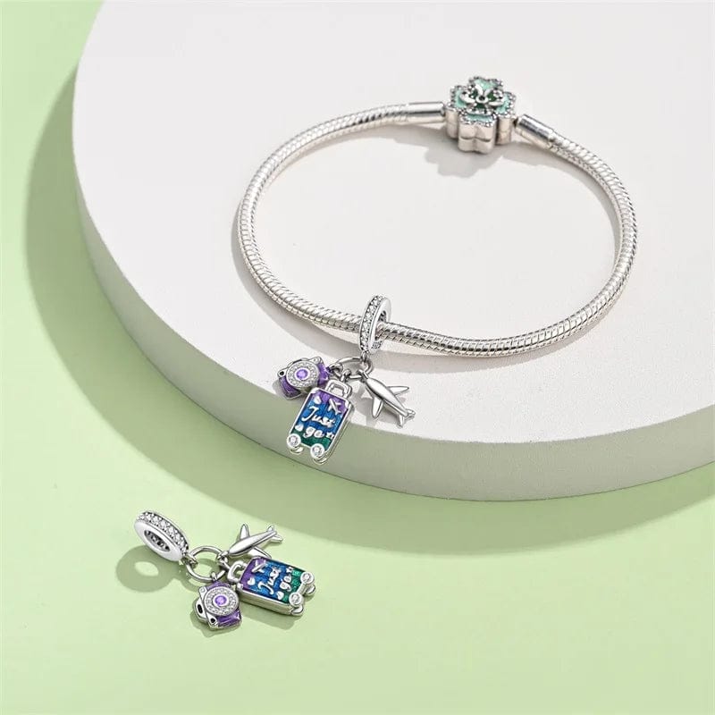 Capture your travel memories with the Camera, Plane, and Suitcase Triple Dangle Charm by Pangama Jewelry. Crafted from , this charm showcases a detailed camera, a jet plane, and a colorful suitcase with the phrase “Just Go,” inspiring endless adventures.