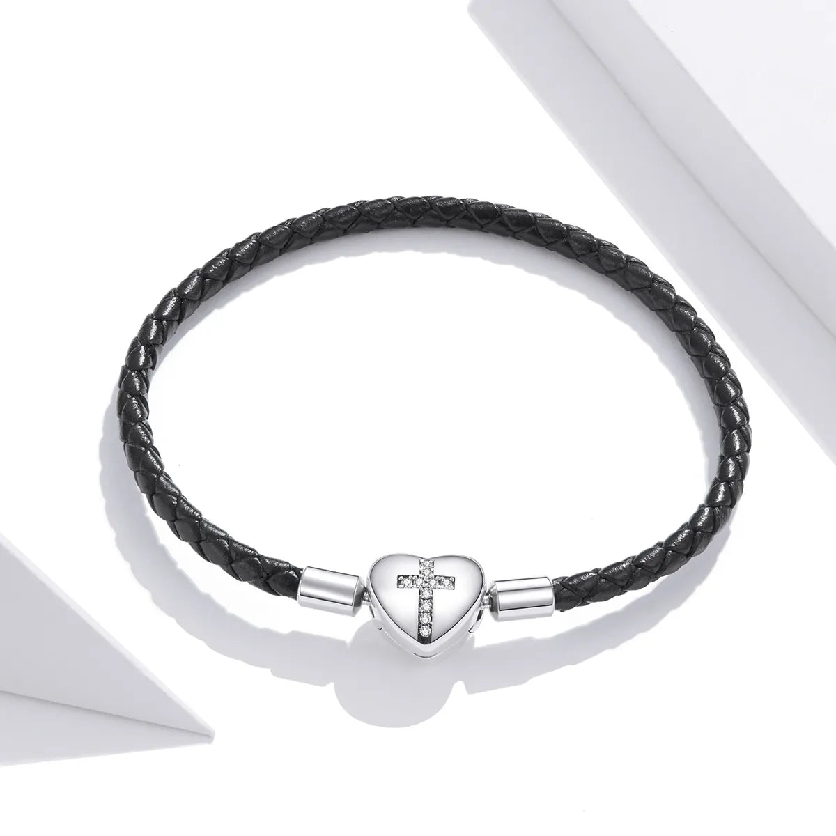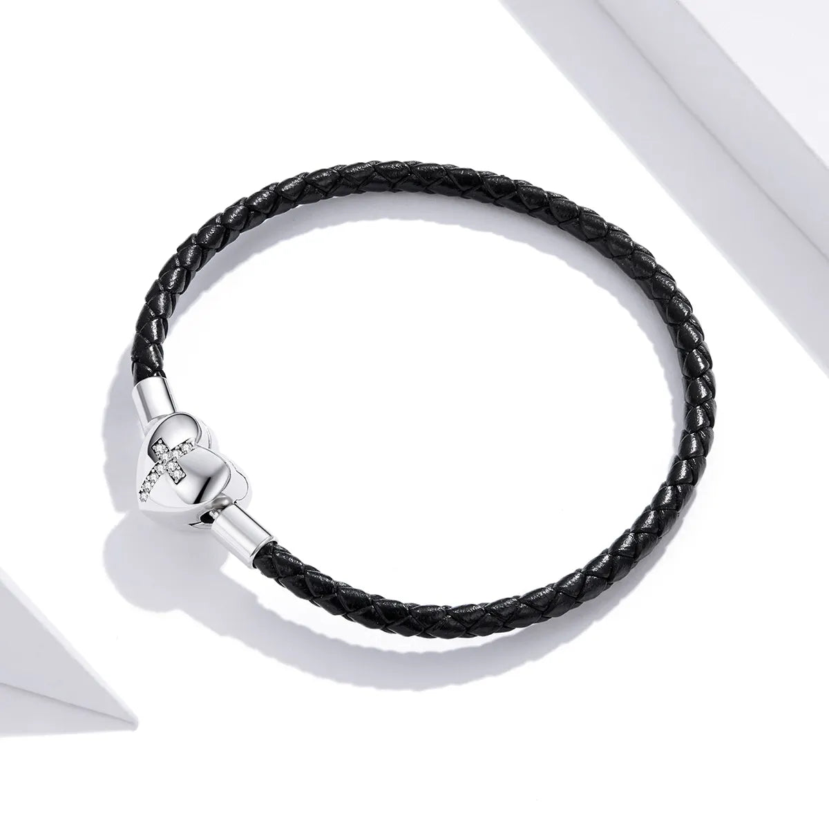 Celebrate faith and style with the Cross Heart Leather Charm Bracelet by Pangama Jewelry. Featuring a sleek black braided leather band and a heart-shaped clasp adorned with a shimmering cross, this bracelet blends spiritual meaning with modern design. Crafted from 925 sterling silver, it offers a meaningful way to carry your beliefs close.