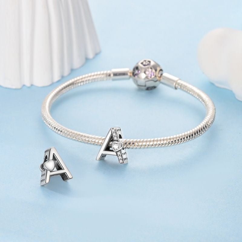 Celebrate your individuality with the Sparkling Heart Letter A~Z Alphabet Charm by Pangama Jewelry. Each letter is elegantly crafted from and adorned with shimmering pavé accents and a delicate heart-shaped cubic zirconia, making it the perfect way to represent your name, initials, or someone special. Whether worn solo or as part of a personalized set, this charm adds a touch of elegance and meaning to your bracelet or necklace.
