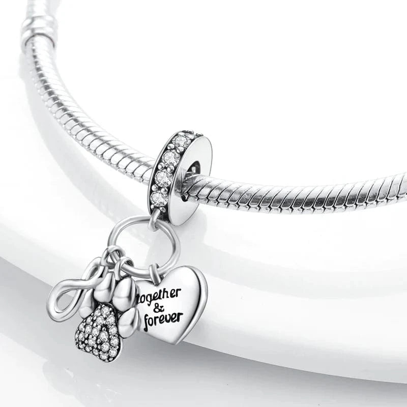 Celebrate the bond with your beloved pet with the Together & Forever Pet Dangle Charm by Pangama Jewelry. This charming design showcases two adorable pets and a heart-shaped dangle, symbolizing the unbreakable connection between you and your furry companion. Made from 925?sterling , this charm is a tribute to love and loyalty.